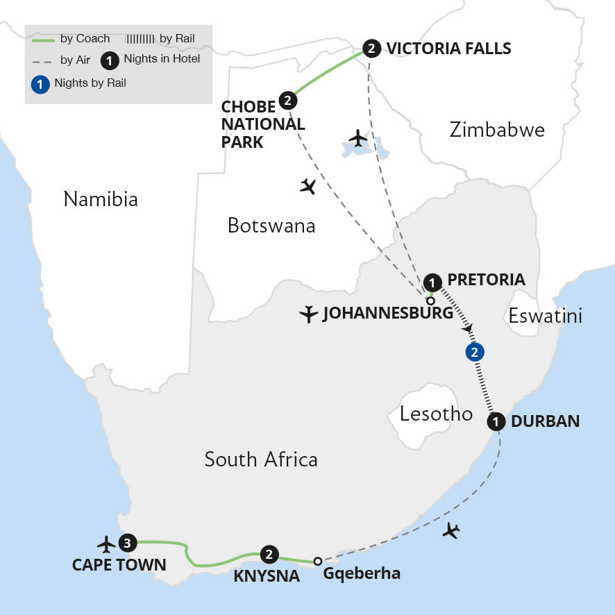 Join us on this sensational tour of Southern Africa, from the glorious Victoria Falls to the multicultural city of Cape Town, with fantastic wildlife viewing in Botswana's Chobe National Park and Nambiti Reserve in Kwa-Zulu Natal. Added to these superb experiences, a rail journey from the city of Pretoria to the coastal metropolis of Durban...