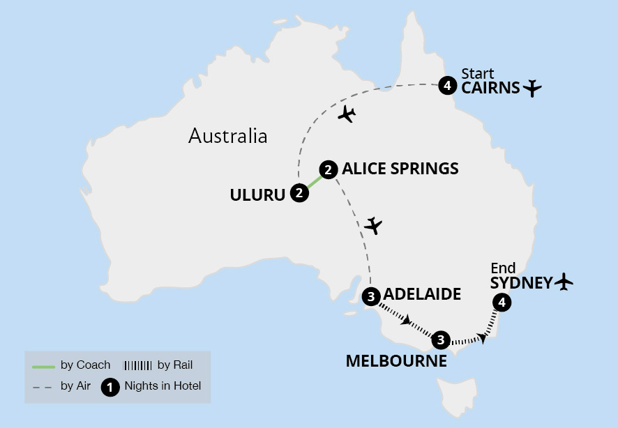 Join us on an epic adventure into this vast, vibrant and varied land to experience Australia's spectacular natural wonders, from the rainforests of tropical Cairns and kaleidoscopic colours of the Great Barrier Reef to the burnished red tones of the ancient sacred site of Uluru. Explore laid-back Adelaide and its world-acclaimed wine region...