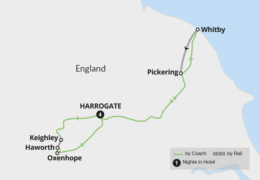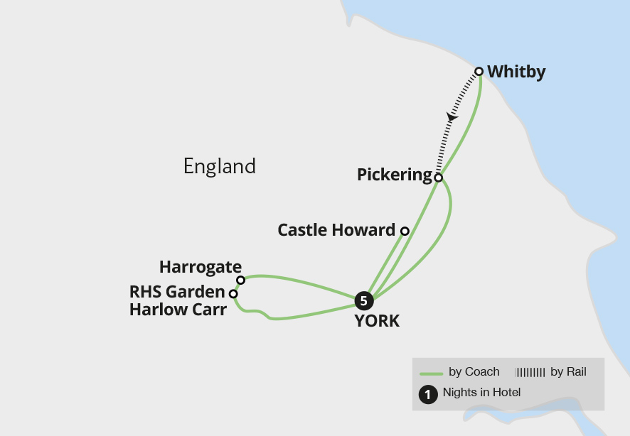 Discover the beauty of Yorkshire on this picturesque rail getaway. Home to timeless towns, sweeping rural landscapes and rich architectural heritage, this is a region full of character and charm just waiting to be explored. Stay in the elegant spa town of Harrogate and visit the coastal resort of Whitby, before enjoying a nostalgic journey...