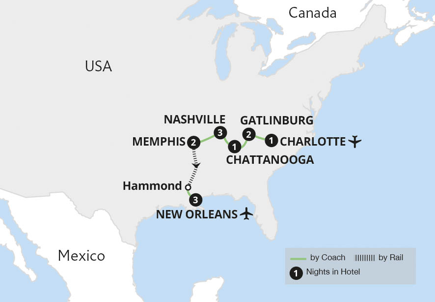 Historic tracks lead us on an unforgettable rail tour through the heartlands of great American music - from Nashville, home of country music, to the blues, soul and rock 'n' roll of Memphis and the expressive jazz of New Orleans. Starting our journey in North Carolina, we discover the music legends of Tennessee, then continue on the City of...