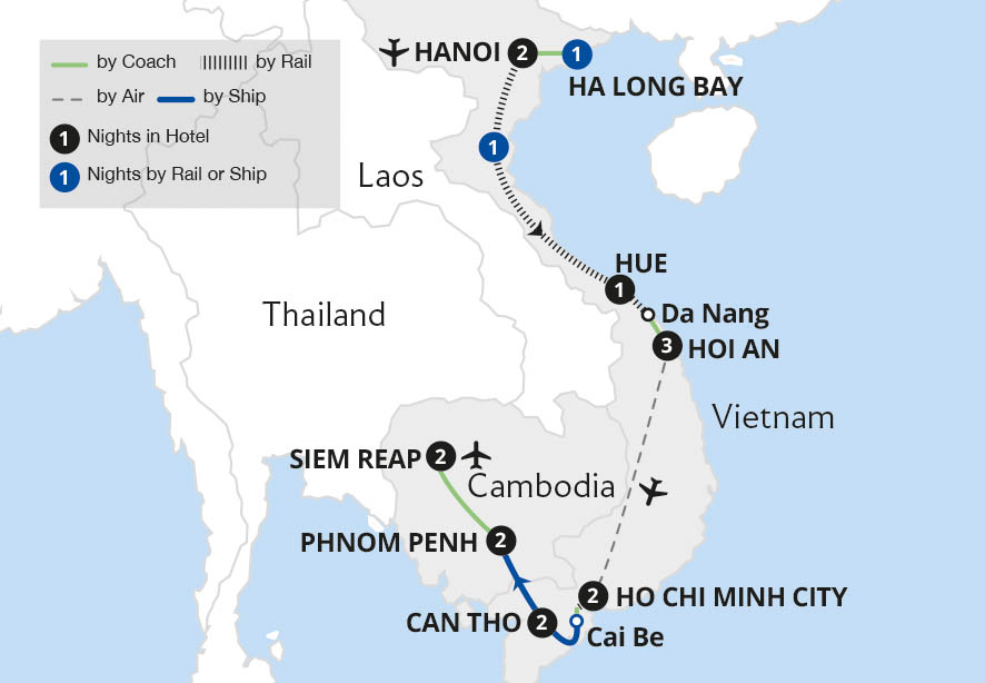 Discover the delights of Vietnam and Cambodia on this incredible grand tour, travelling from bustling Hanoi to the ancient temples of Siem Reap. Delight in the beauty of Ha Long Bay on an overnight cruise, and ride in a Violette cabin aboard the Reunification Express train along Vietnam's coast, visiting regal Hue and pretty Hoi An before ...