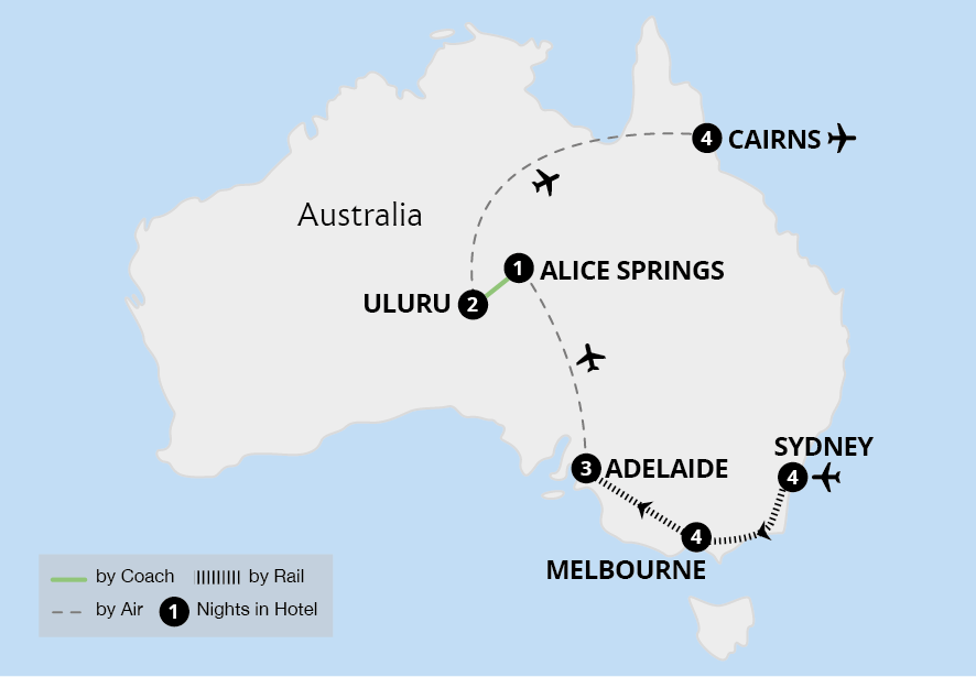 Join us on an epic adventure into this vast, vibrant and varied land to experience Australia's spectacular natural wonders, from the rainforests of tropical Cairns and kaleidoscopic colours of the Great Barrier Reef to the burnished red tones of the ancient sacred site of Uluru. Explore laid-back Adelaide and its world-acclaimed wine region,...