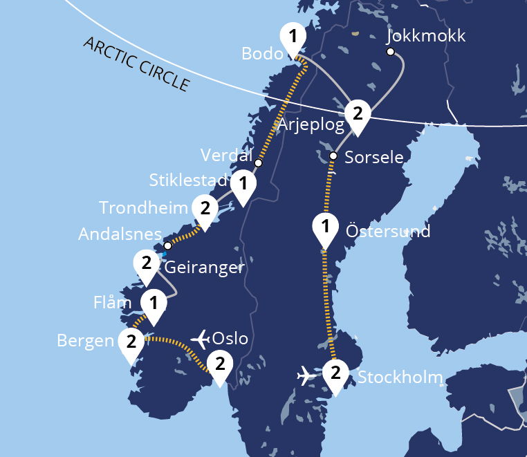 Join us on a summertime journey across the length of Norway - from Oslo to the Arctic Circle. Travel on four of the country's world-renowned rail routes, the Flåm, Bergen, Nordland and Rauma railways and cruise across the Geirangerfjord, discovering otherworldly landscapes. On this top-rated tour of Norway's beautiful cities and the arctic...