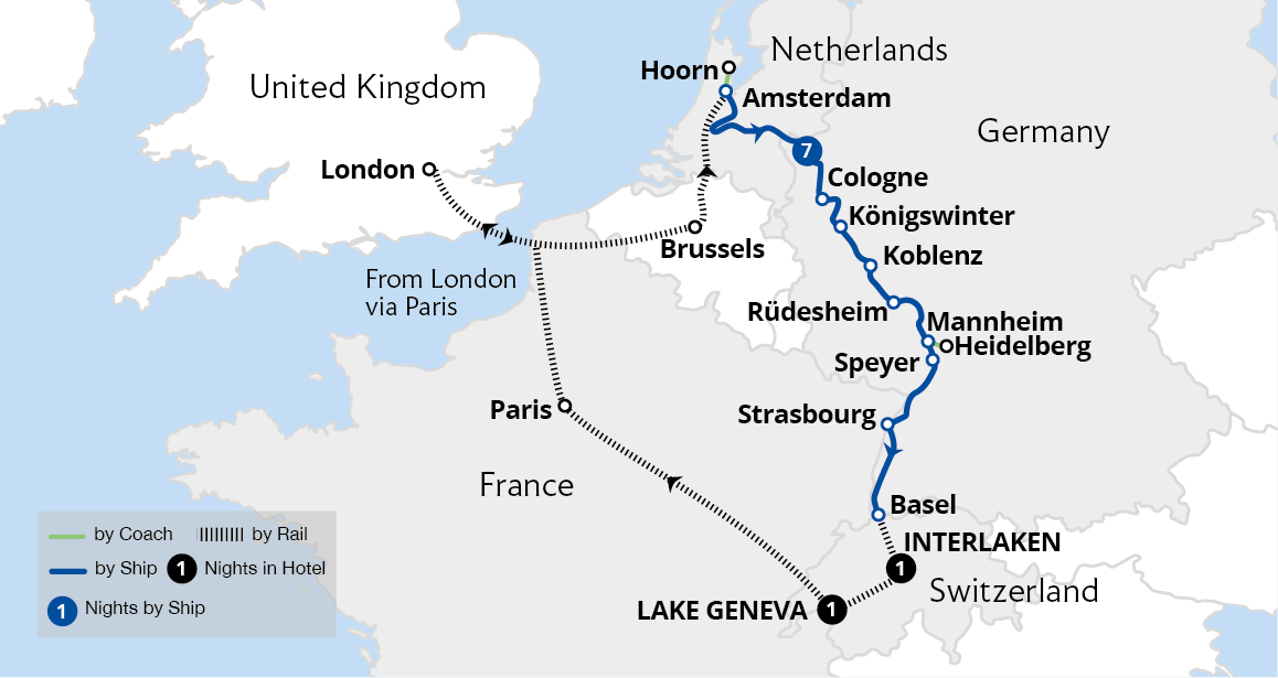 Enjoy one of the world's finest rail journeys aboard the legendary Glacier Express to Zermatt, and admire Matterhorn views from the charming Gornergrat Railway. Descending the Alps, set sail on a sensational Rhine cruise, indulging in luxurious amenities and superb service. Enroute, savour incredible vistas of the stunning Rhine Gorge,...
