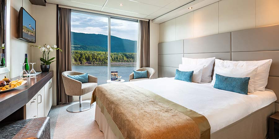 These cabins are impressively spacious when compared to other river ships. Found on the on Strauss and Mozart Decks, each features floor-to-ceiling, sliding glass doors as well as a French-style balcony.