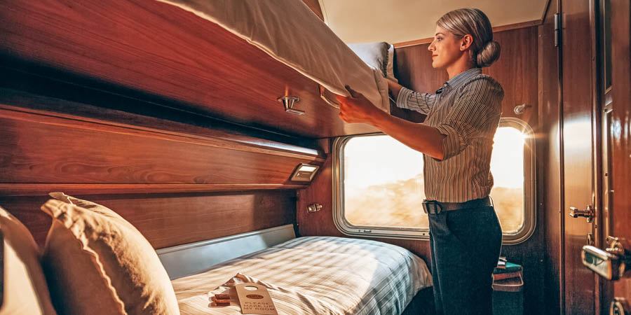 Relax in a private retreat in The Ghan's Gold accommodations. These classic rooms feature everything travellers desire for a restful journey in the setup that best meets their needs. Guests can choose from Gold Twin cabins with a compact en-suite and upper and lower berths, Gold Single cabins with a lower-level single bed and in-room wash basin, Gold Access cabins thoughtfully designed for mobility-impaired guests, or spacious Gold Suites with a three-quarter-size double bed, an upper berth, and an en-suite bathroom.